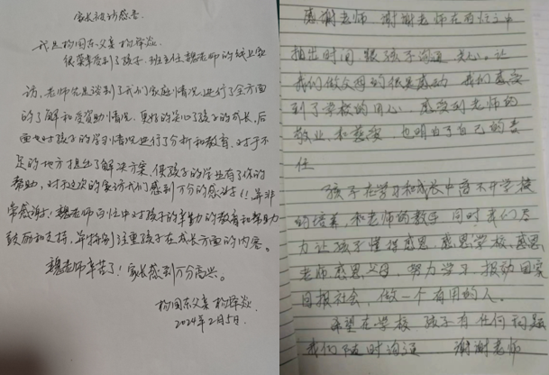 家访结束后,员工家长们通过一封封感谢信表达了对公司和老师们的感激之情,表示将继续配合好公司育人工作,助力员工成长成才。受访员工表示,今后将继续努力学习,不辜负公司和老师的期望,以优异的成绩回报公司、回馈社会。