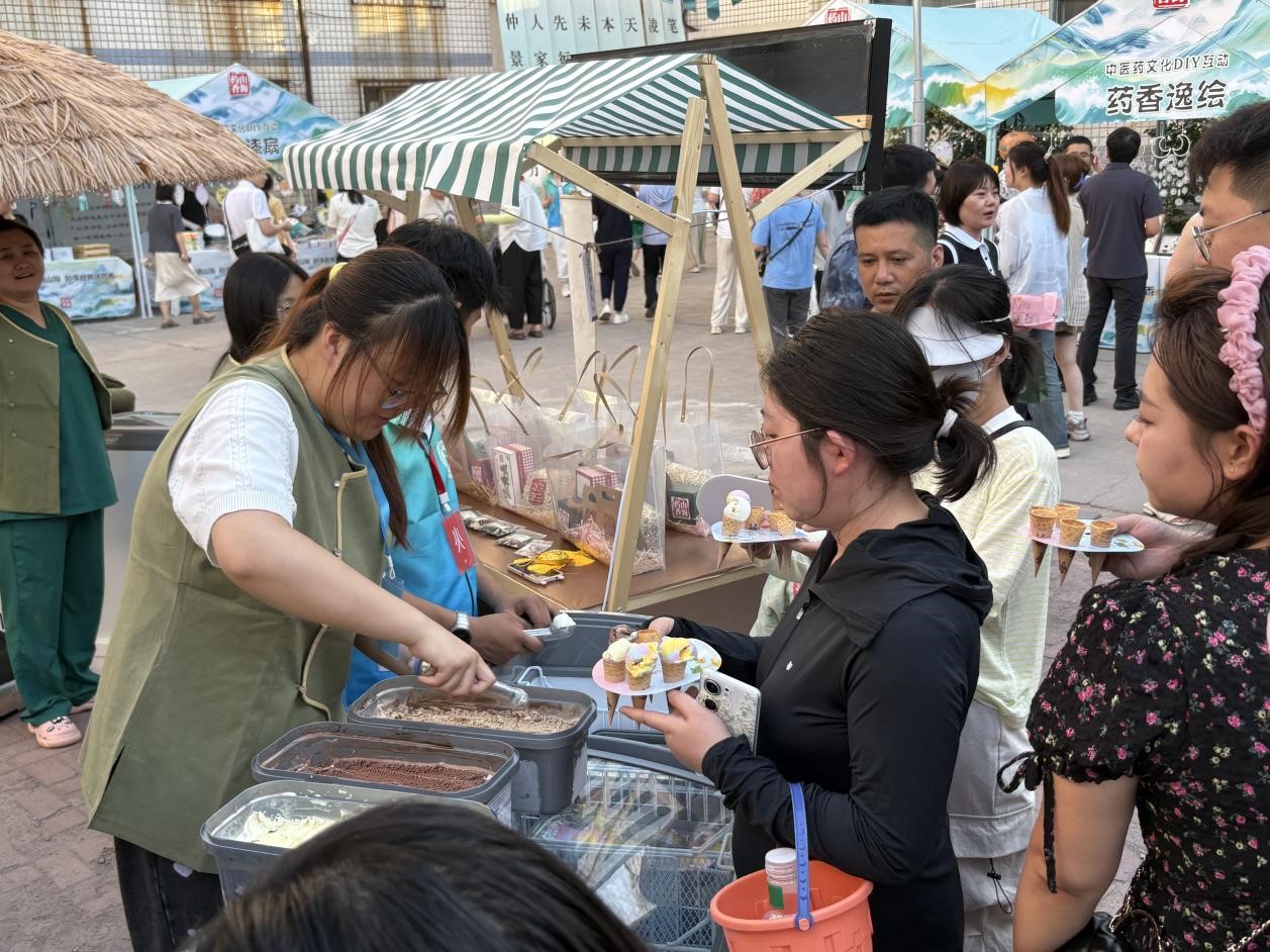 当暮色温柔笼罩,康养夜市瞬间汇聚人潮。本草协会的百名志愿者身着统一服饰,迅速到达各个展位,成为连接专业中医药文化与广大市民的亲切桥梁。“同学,这个香囊里的药材主要有什么功效?”“这款代茶饮适合我这样的体质吗?”面对络绎不绝的咨询,志愿者们依托课堂所学与前期培训,热情洋溢、耐心细致地为市民讲解产品的中医药理论基础、适用人群及保健价值。他们将深奥的中药知识转化为通俗易懂的生活语言,让岐黄之术的馥郁芬芳弥漫在夏夜的烟火之中。他们忙碌的身影、真诚的微笑、专业的解答,成为夜市里最温暖、最亮眼的标识之一。