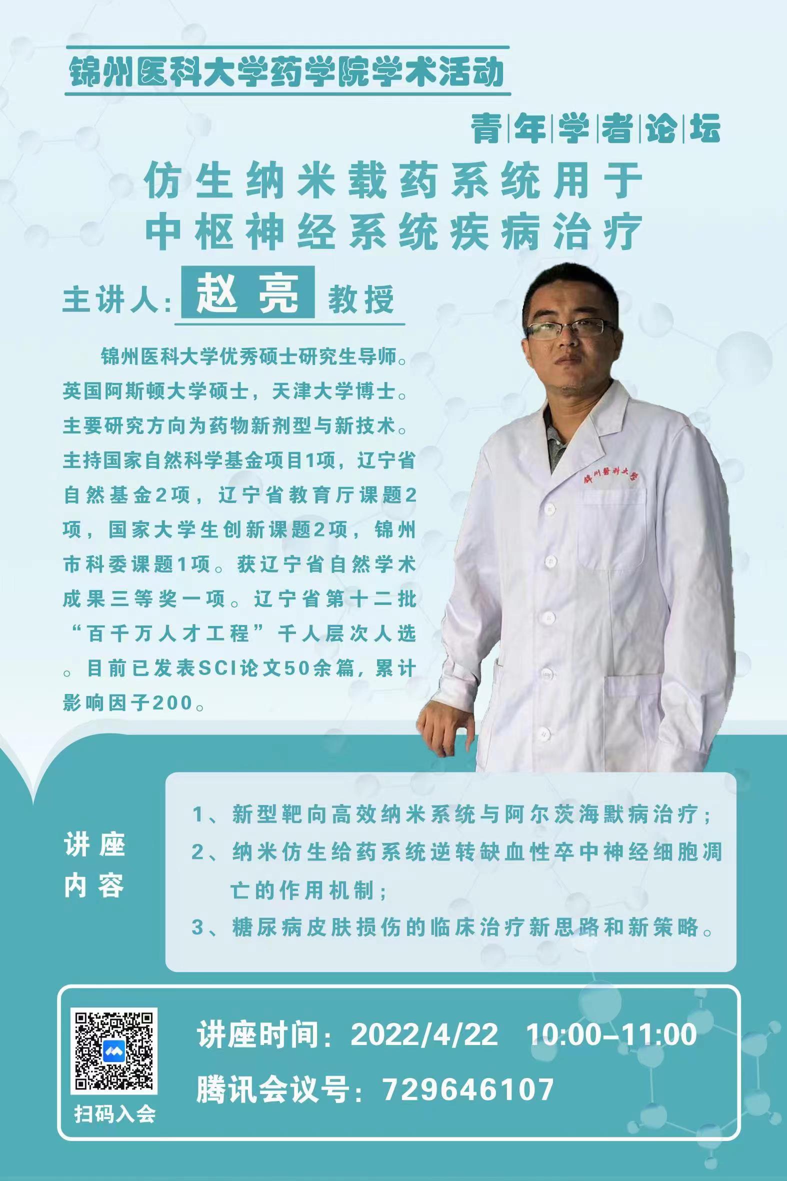 伟德国际bevictor1946学术活动第二讲,暨伟德国际bevictor1946青年学者论坛将于2022年4月22日10:00召开。届时特邀伟德国际bevictor1946优秀青年科研工作者赵亮教授做“仿生纳米载药系统用于中枢神经系统疾病治疗”讲座,讲座线上进行,腾讯会议号:729646107,诚邀广大师生参加。